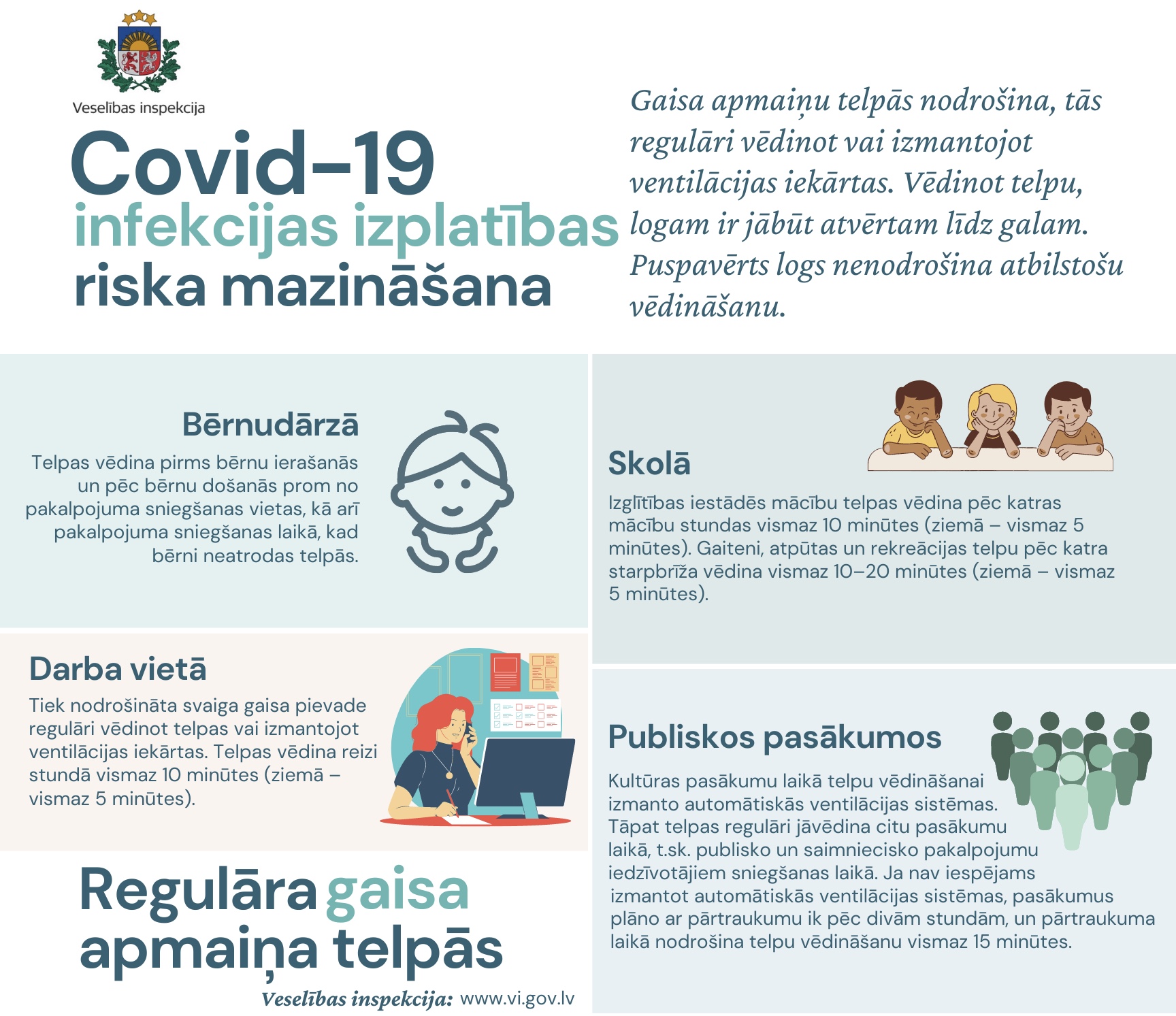 Tiek nodrošināta svaiga gaisa pievade regulāri vēdinot telpas vai izmantojot ventilācijas iekārtas. Telpas vēdina reizi stundā vismaz 10 minūtes (ziemā – vismaz 5 minūtes).